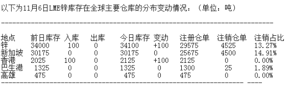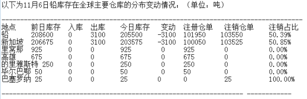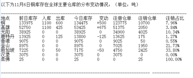 LME 11月6日有色金屬庫存分布情況