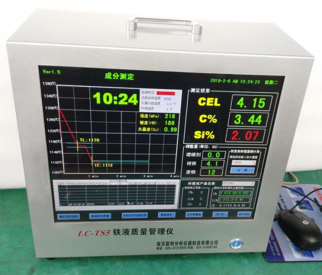 用于爐前快速測定灰鑄鐵和球墨鑄鐵鐵水的碳當量CE\%、碳含量C\%、硅含量Si\%、球化率SG\%等鐵水性能;預(yù)測普通灰鑄鐵的抗拉強度等。非專業(yè)人員經(jīng)簡單培訓即可操作;在鐵水可等待的時間內(nèi)完成檢測,然后根據(jù)自動計算出的增碳劑、硅鐵、廢鋼投放量對鐵水成份進行調(diào)整,有效的指導(dǎo)生產(chǎn)實踐。