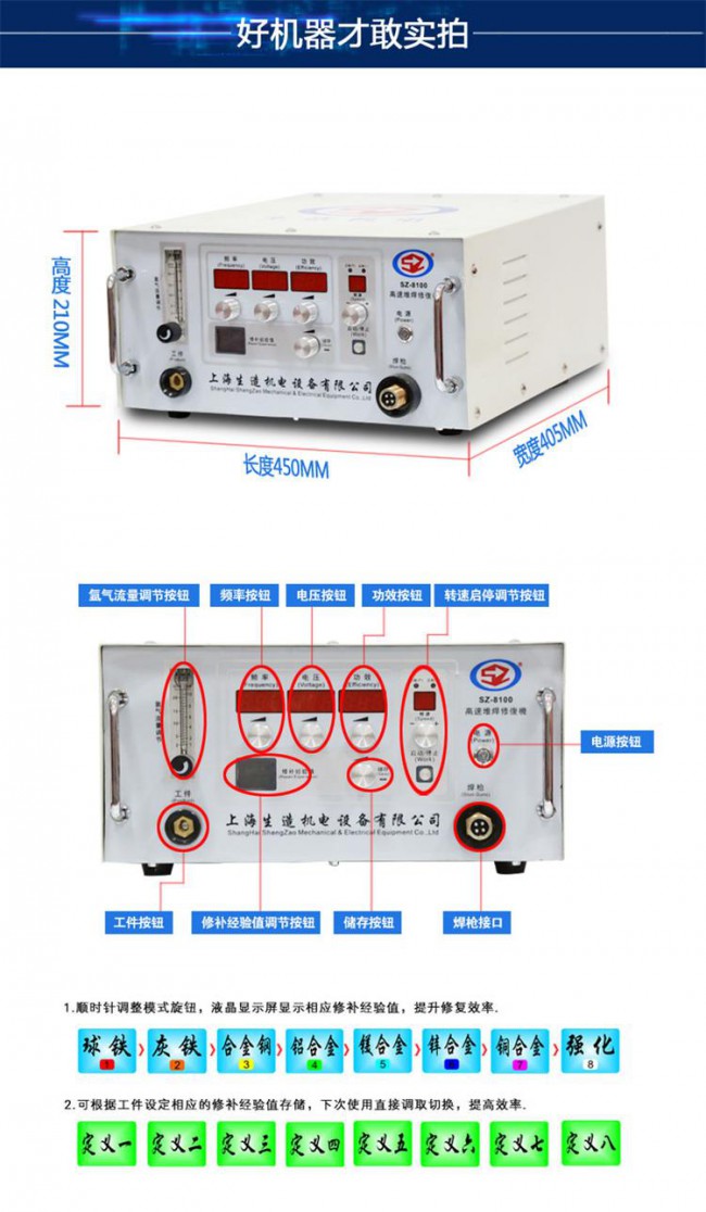 適用焊材:由于SZ-8100獨特的控制方式,輸出能量高,控制精確,所以焊材的適用性極廣。除常規(guī)的電火花堆焊專業(yè)焊材外,其他焊機所用的直徑在1.0-3.2mm的直條焊材多數(shù)適用,普通的電焊條去藥皮后也可使用。