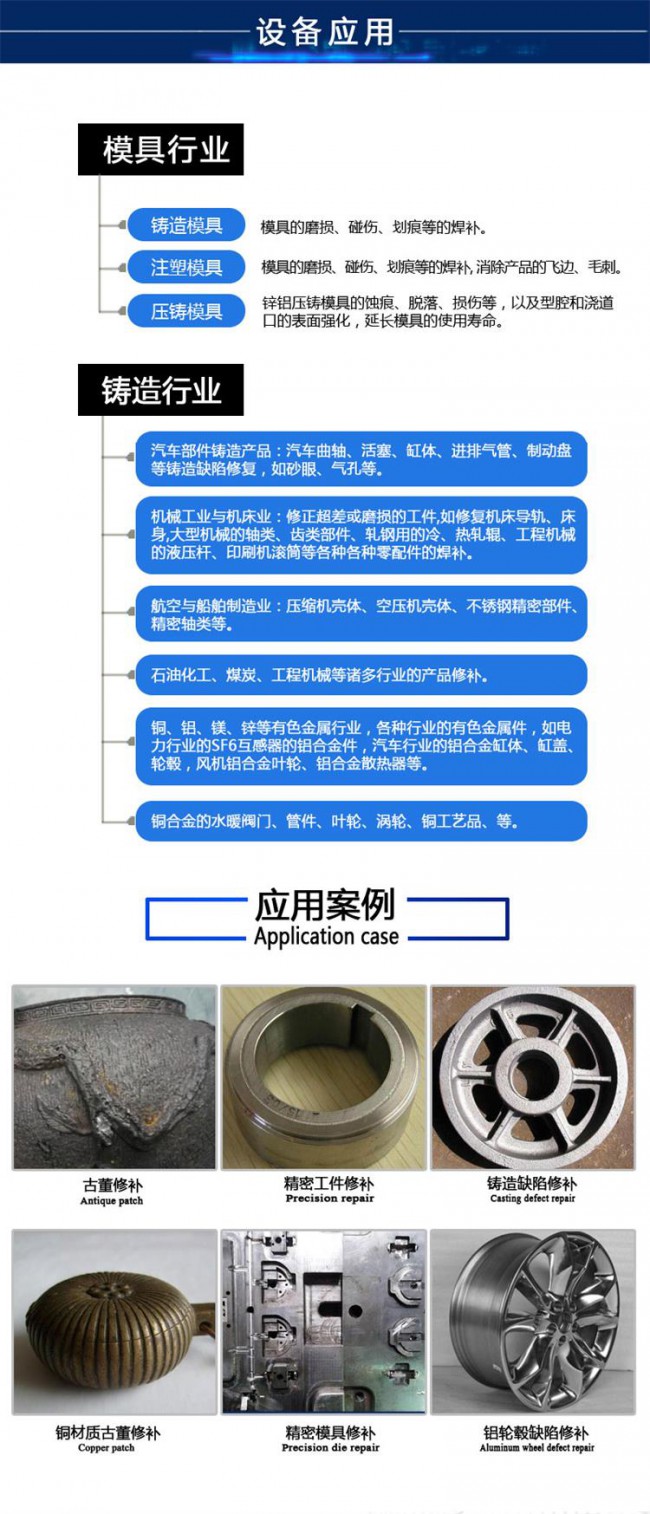 一機多用:可進行堆焊、表面強化等功能??蓪谏饘?球鐵、灰鐵、不銹鋼等)、有色金屬(銅、鋁等)進行焊補。